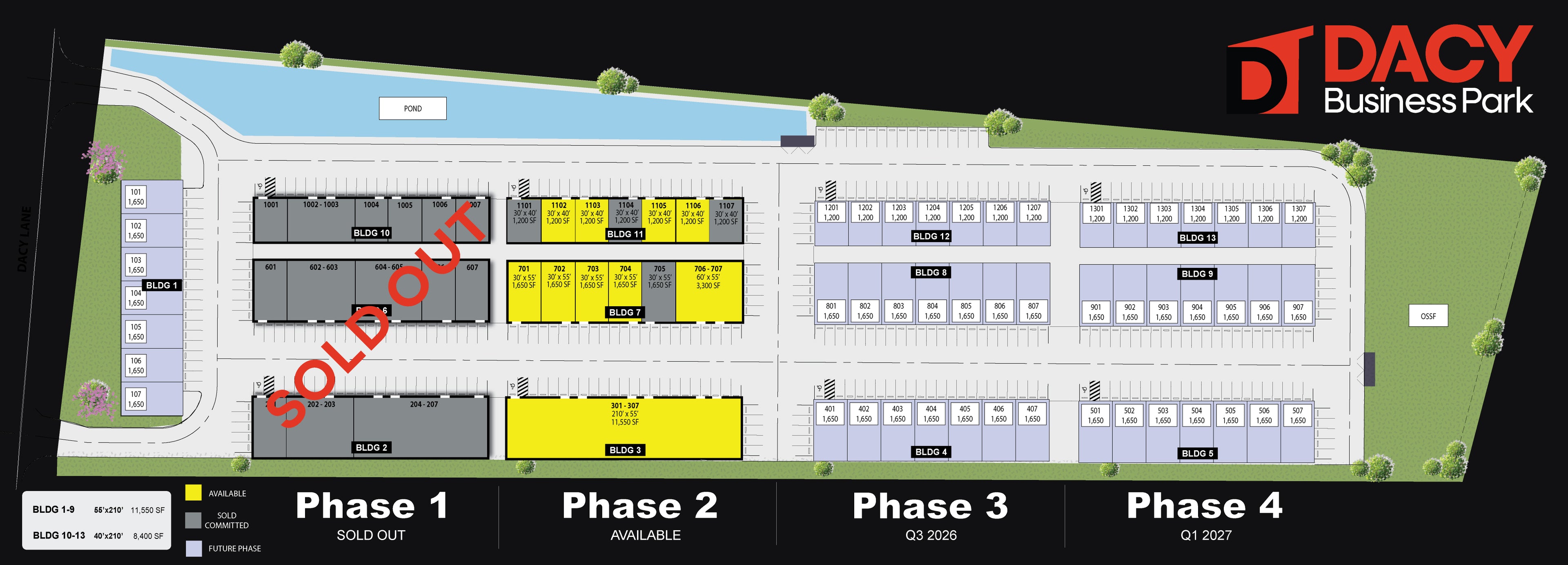 The business park is built in 4 phases comprising a total of 13 buildings covering 137,550 sqft. Phase 1 Sold Out. Phase 2 was just completed and is available.