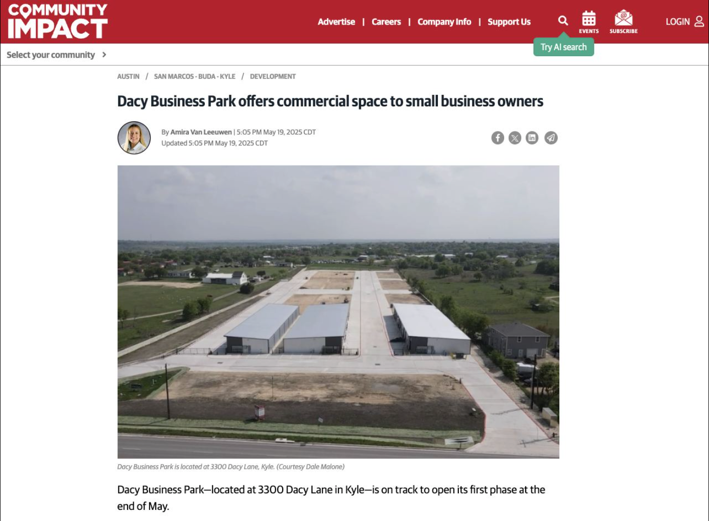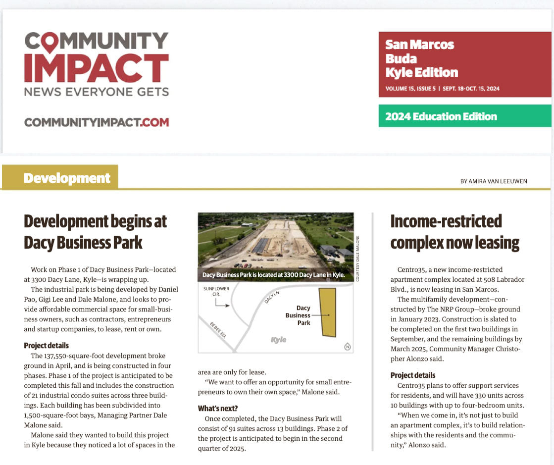 Located in the fast-growing south Austin community of Kyle, Texas, Dacy Business Park offers a unique opportunity for business owners tired of rent increases and the lack of ownership. Our business park features 13 buildings, totaling 137,550 square feet of flexible and affordable commercial space. Each building is subdivided into small bays ranging from 1,200 up to 12,000 square feet, providing contractors, entrepreneurs, and startup companies the flexibility to occupy as much or as little space as they need.