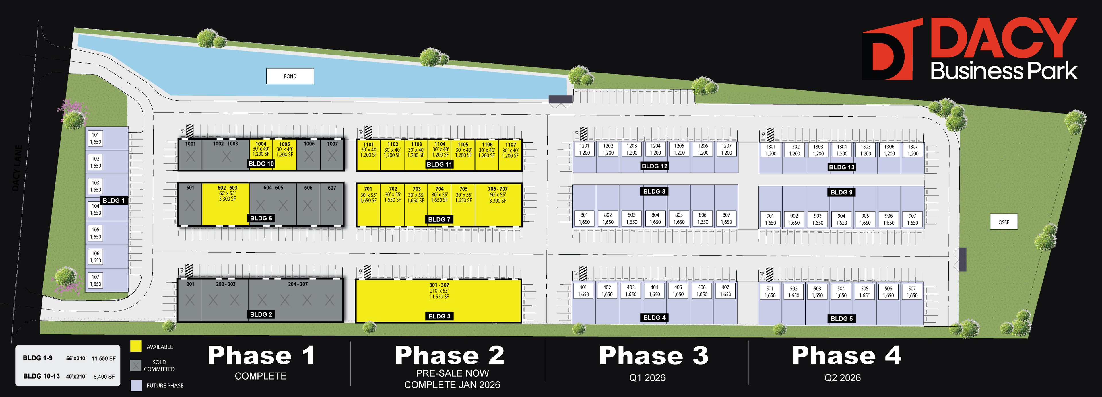 Why continue renting when you can own your own office, warehouse, or "flex space" for about the same cost—or even less? By investing in one of our customizable buildings or suites, you can turn your monthly rental expenses into a secure investment that builds equity and appreciates over time. Dacy Business Park offers move-in-ready solutions tailored to your business, storage, or hobby needs.